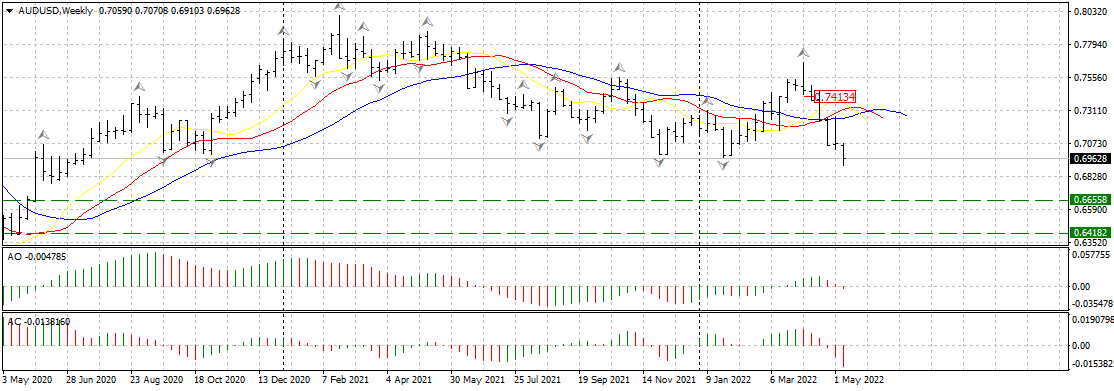 В начале мая РБА резко поднял базовую процентную ставку сразу на 25 базисных единиц. Это привело к мгновенному укреплению австралийской валюты, но все же уйти выше 72 фигуры и сломать сопротивление у линий аллигатора на недельном таймфрейме у покупателей “оззи” не получилось. Спустя несколько дней после заседания РБА пара потеряла больше 200 пп, а вчера прорвала значимую поддержку у 0.7000 и обновила январские минимумы текущего года у 0.6970. Если покупателям aud/usd не удастся переломить ситуацию и вернуться выше 0.7000, нисходящее движение возобновится с новой силой в направлении 0.6600-0.6300. Технически, по паре мы наблюдаем отработку разворотного сигнала на продажу от третьего апреля с точкой входа у 0.7420. Цена на всех старших таймфреймах ниже линий аллигатора, осцилляторы АО и АС красного цвета, что дополнительно свидетельствует в пользу продаж.