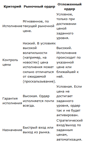 Сравнительная таблица: Отложенные vs. Рыночные ордера