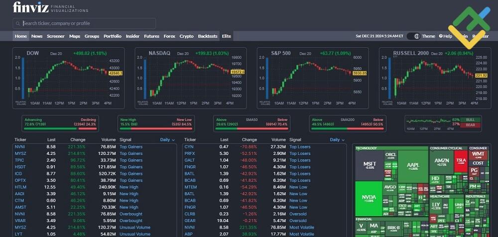 Скринеры акций. Нужны для торговли акциями по фундаментальному анализу. Это сервисы, дающие статистику по каждой компании. Они позволяют фильтровать акции на основе множества параметров – объем торгов, финансовые показатели (EBITDA, P/E, уровень долговой нагрузки и т.д.), технические индикаторы и другие метрики. Для фондового рынка США один из лучших скринеров – Finviz.