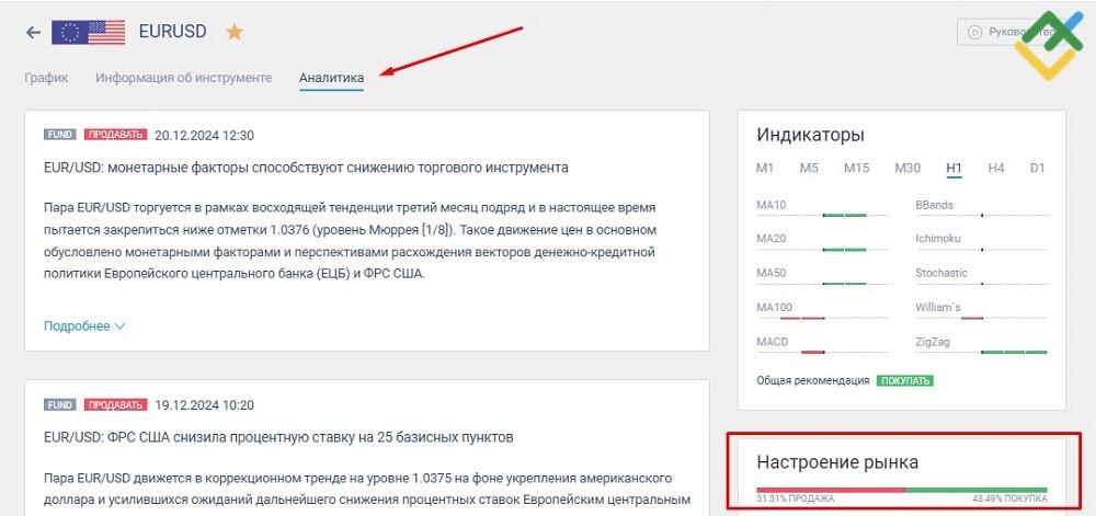 Настроения рынка. Данный индикатор показывает, какое количество сделок открыто в одну и другую сторону. Например, в торговой платформе LiteFinance этот индикатор можно найти для каждого актива в его описании. Значения формируются на основе агрегированных данных внутри системы брокера.
