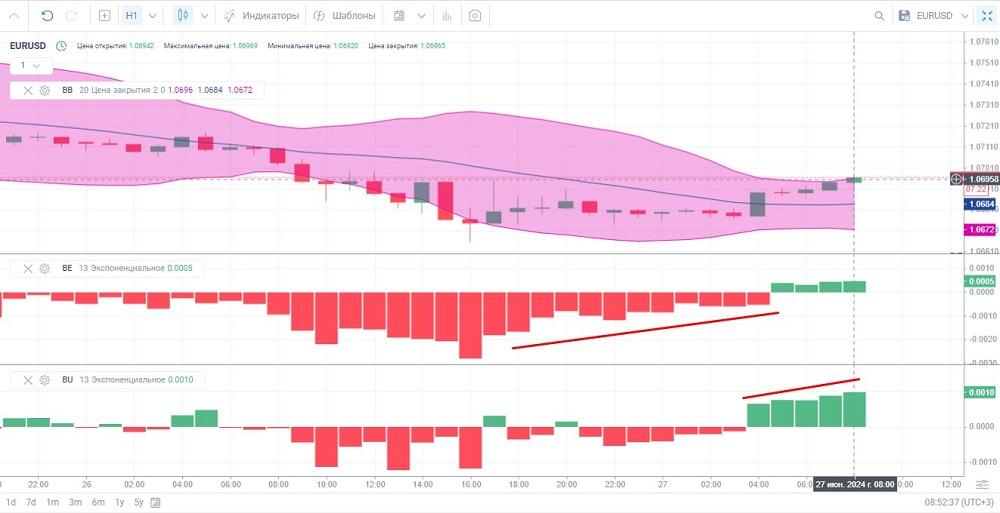 Валютная пара — EUR/USD. Дополнительно к индикаторам силы «быков» и «медведей» добавлен канальный индикатор Полосы Боллинджера со стандартными настройками. Таймфрейм — Н1. Дата — вечер 26.06.2024.