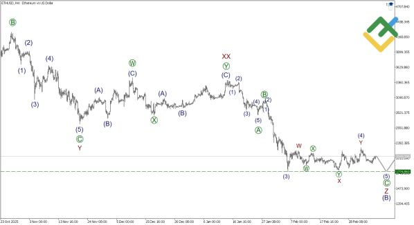 Эфириум формирует восходящий зигзаг (A)-(B)-(C), с импульсом (A) уже построенным. Коррекция (B) – тройной зигзаг W-X-Y-XX-Z, где Z принимает вид [A]-[B]-[C]. Коррекция (4) of [C] завершена как двойная тройка W-X-Y. Предстоит снижение в (5) of [C] к 1774.86, что соответствует уровням Фибоначчи. Это отражает общую волатильность крипторынка, где коррекционные волны часто удлиняются.