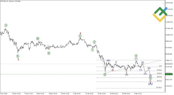 В долгосрочной перспективе Биткоин формирует медвежий зигзаг (A)-(B)-(C), где импульс (A) доминирует. На графике видны завершенные четыре подволны импульса, а сейчас развивается подволна 5. Коррекция [4] of 5 проявилась как двойная тройка, что указывает на скорое снижение в [5] of 5. Уровень 59456.39 выступает ключевой поддержкой, где может завершиться текущий цикл. Технический анализ подтверждает медвежий импульс: цена тестирует сопротивления, но объемы продаж растут.