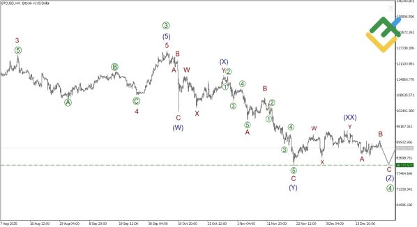Недавно завершились подволны (Y) и (XX), причём последняя реализовалась как двойной зигзаг. Теперь на повестке — завершение волны (Z), которая, по предварительным оценкам, направлена к уровню 80 770,57 — минимуму волны (Y). Это указывает на вероятность краткосрочного снижения.