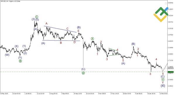 По XRPUSD в старшем масштабе формируется бычий импульс (1)-(2)-(3)-(4)-(5), однако текущая фаза — коррекция (4), принимающая форму двойного зигзага W-X-Y.