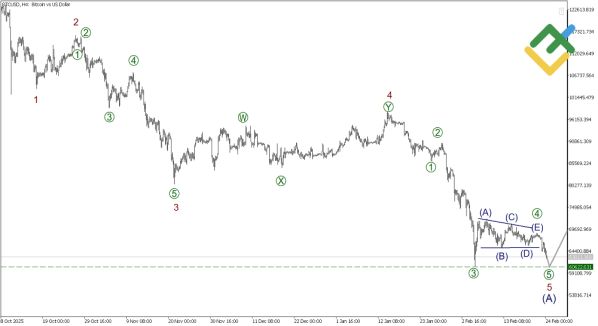BTCUSD: формируется финальная часть медвежьего импульса (A). Вероятное снижение к 60622.63. Приоритет — короткие позиции.