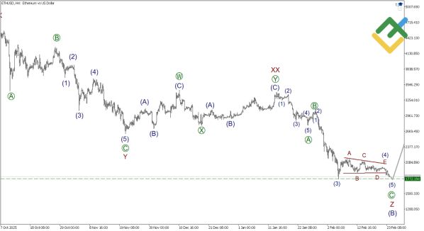 ETHUSD: продолжается формирование медвежьей волны Z в рамках коррекции (B). Цель снижения — 1772.19.