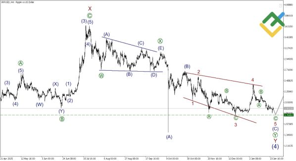 Пара XRPUSD в долгосрочной перспективе формирует бычий импульс (1)-(2)-(3)-(4)-(5). Однако на текущем этапе рынок проходит через коррекцию (4), представленную как двойной зигзаг W-X-Y.