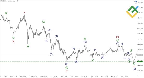Недавно завершились волна Y и боковая связка XX (в форме двойной тройки). Ожидается, что финальная волна Z развернётся вниз как простой зигзаг A-B-C и достигнет уровня 2 622,82 — того же минимума, что и предыдущая подволна Y.