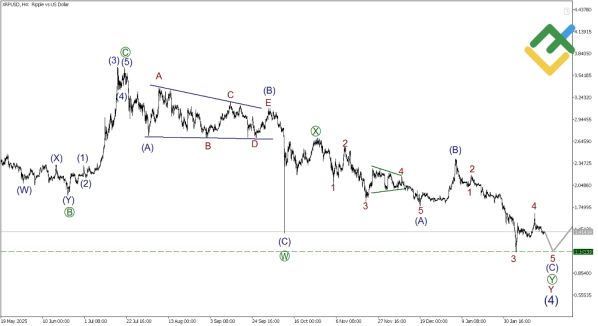 По XRPUSD в глобальной структуре продолжает формироваться бычий импульс (1)-(2)-(3)-(4)-(5). В настоящий момент развивается коррекционная волна (4), представленная двойным зигзагом W-X-Y.
