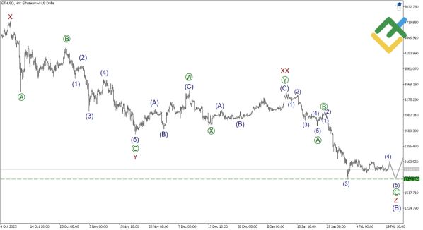 По ETHUSD формируется крупная восходящая модель зигзага (A)-(B)-(C). Импульсная волна (A) завершена. В настоящее время строится коррекция (B) в форме тройного зигзага W-X-Y-XX-Z.