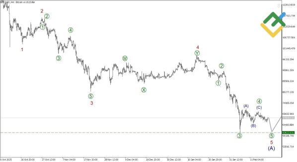 BTCUSD: развивается заключительная часть импульсной волны (A). Ожидается снижение к уровню 60622.63. Предпочтение — сделки на продажу.