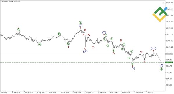 Последние данные свидетельствуют о завершении волн (Y) и связующей волны (XX). На текущем этапе формируется начальная часть заключительной волны (Z), направленной вниз. Целевой уровень — 80 842.00, что соответствует минимуму, зафиксированному в подволне (Y).