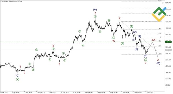 Эфириум (ETHUSD) на 4-часовом графике формирует крупный восходящий зигзаг (A)-(B)-(C). Волна (A) уже завершена как импульс, а текущая фаза — коррекция (B) — развивается в виде тройного зигзага: W-X-Y-XX-Z.