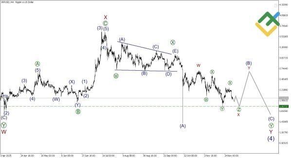 Глобальная структура XRPUSD указывает на развитие восходящего импульса (1)–(2)–(3)–(4)–(5). Однако на текущем этапе рынок находится в коррекционной волне (4), которая принимает форму двойного зигзага W–X–Y.