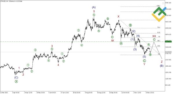 На H4-графике ETHUSD формируется крупный восходящий зигзаг (A)–(B)–(C). Импульсная волна (A) завершена, и сейчас рынок проходит фазу коррекции (B). Эта коррекция приобретает форму тройного зигзага: W–X–Y–XX–Z.