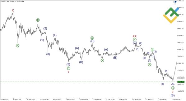 Эфириум формирует крупный восходящий зигзаг (A)-(B)-(C). Импульс (A) завершен, а коррекция (B) строится как тройной зигзаг W-X-Y-XX-Z. Волна Y готова, а связующая XX – в виде двойной тройки. Финальная Z направлена вниз к 1772,19, где ранее фиксировался минимум подволны (3). Это предполагает импульсное снижение с подволнами, подходящее для коротких сделок.