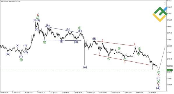 В долгосрочной перспективе рипл строит бычий импульс (1)-(2)-(3)-(4)-(5). Текущая коррекция (4) выглядит как двойной зигзаг W-X-Y. Активная волна Y также напоминает двойной зигзаг [W]-[X]-[Y]. В [Y] завершены импульс (A) и коррекция (B), а (C) развивается как конечный диагональник 1-2-3-4-5. Коррекция 4, вероятно, закончена, и впереди снижение в [C] of 5 к 1,142. Этот уровень совпадает с расширением Фибоначчи, типичным для диагоналей.