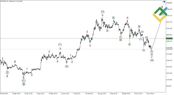 На ETHUSD в рамках H4 отмечается формирование двойного зигзага W-X-Y как части крупной коррекции. Сейчас развивается импульс [C] внутри волны-связки X. В его структуре уже завершены подволны (1)-(2)-(3) и, вероятно, (4) (в виде треугольной коррекции W-X-Y).