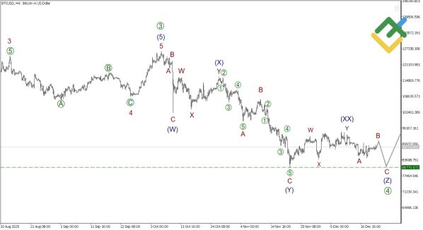 На четырехчасовом таймфрейме (H4) у Биткоина завершена импульсная волна [3] в рамках восходящей структуры [1]-[2]-[3]-[4]-[5]. Текущее снижение цены соответствует коррекционной волне [4], которая, по всем признакам, формируется как сложный тройной зигзаг (W)-(X)-(Y)-(XX)-(Z).