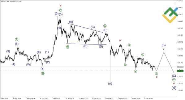 Глобальная структура XRP также соответствует бычьему импульсу (1)-(2)-(3)-(4)-(5). Однако текущее движение — это коррекционная волна (4), сконструированная как двойной зигзаг W-X-Y.
