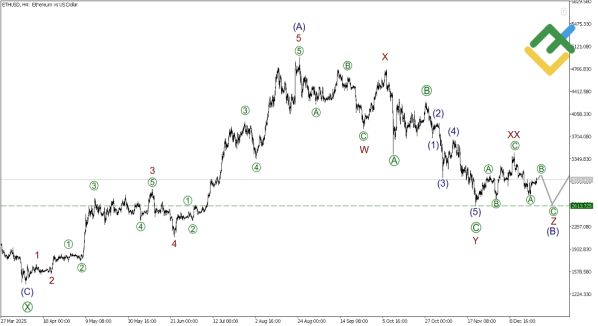 Недавно завершились волны Y и XX (последняя — в виде стандартного зигзага [A]-[B]-[C]). Ожидается завершающий медвежий импульс — волна Z, которая, скорее всего, примет форму простого зигзага [A]-[B]-[C] и направит цену к минимуму 2 613,72 USD — уровню, ранее отмеченному подволной Y.