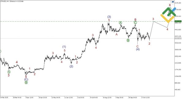 Анализ ETHUSD на H4-графике показывает завершение крупной коррекционной структуры в виде двойного зигзага W-X-Y. В данный момент развивается волна X, которая сама по себе представляет собой зигзаг [A]-[B]-[C]. Импульс [A] и коррекция [B] уже сформированы, а в настоящее время строится подволна [C]-3.
