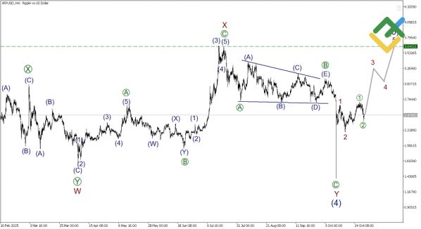 По паре XRPUSD в долгосрочной перспективе формируется классический пяти-волновой бычий импульс (1)-(2)-(3)-(4)-(5). Коррекция (4) завершилась в виде сложной структуры — двойной тройки W-X-Y, что типично для активов с высокой ликвидностью. Сейчас рынок находится в фазе развития волны (5), где уже сформированы подволны 1 и 2, а активно строится импульс 3.