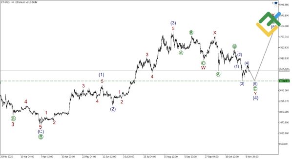 На графике ETHUSD выделяется крупная коррекция в формате двойного зигзага W-X-Y. Связка X развивается с возможной структурой зигзага [A]-[B]-[C]: импульс [A] и коррекция [B] сформированы, начато развитие импульса [C]. Внутри него завершены три подволны, а коррекционная стадия (4) принимает форму двойного зигзага W-X-Y. Ожидается завершение волны Y у отметки 3047.41.