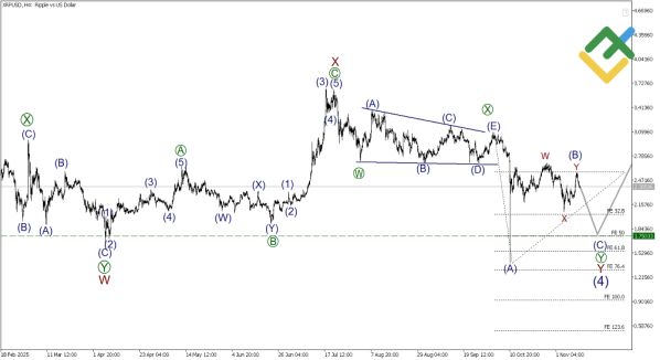 В рамках долгосрочного сценария по XRPUSD развивается бычий импульс с этапами (1)-(2)-(3)-(4)-(5), а текущая коррекция (4) рисует двойной зигзаг W-X-Y. Подволны W и X завершены, волна Y продолжается и также принимает форму двойного зигзага меньшего порядка. Ожидается, что снижение подволны (C) of Y достигнет отметки 1.750, что соответствует 50% расширения по Фибоначчи от импульса (A).