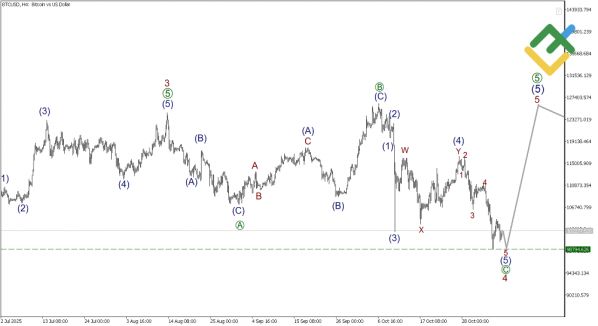 На графике BTCUSD формируется завершающая часть понижательной волны [C] в рамках коррекционной структуры волны 4. Эта структура напоминает волновую плоскость [A]-[B]-[C], где подволны [A] и [B] уже завершены.