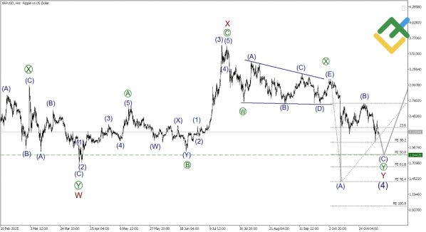 Для XRPUSD текущая коррекционная волна (4) представлена в виде двойного зигзага W-X-Y более высокого порядка. Волны W и X уже сформированы, сейчас развивается волна Y, которая, в свою очередь, также имеет внутреннюю структуру W-X-Y.