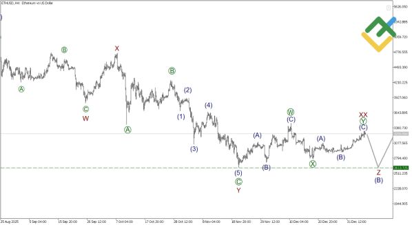 На четырехчасовом графике ETHUSD формируется восходящий зигзаг (A)-(B)-(C). Волна (A) уже завершена, а коррекция (B) принимает сложную форму тройного зигзага W-X-Y-XX-Z. Недавно рынок завершил волны Y и XX (последняя — в виде двойной тройки), что открывает путь к финальной волне Z.