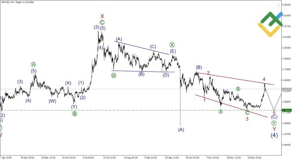 Актив XRPUSD в глобальной перспективе развивает бычий импульс (1)–(5). Текущая фаза — коррекция (4), принимающая форму двойного зигзага W-X-Y. Внутри финальной волны Y наблюдается подструктура [W]-[X]-[Y], где уже завершены импульсная волна (A) и коррекция (B).