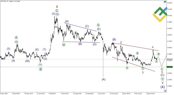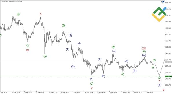 На H4-графике ETHUSD формируется восходящий зигзаг (A)-(B)-(C). Импульс (A) готов, коррекция (B) — тройной зигзаг W-X-Y-XX-Z. Волна Y и связка XX как двойная тройка завершены. Финальная волна Z направлена к 2 614 долларам — уровню подволны Y. Это учитывает влияние апгрейдов сети на ликвидность, но в краткосрочке преобладают продажи из-за рыночных настроений.