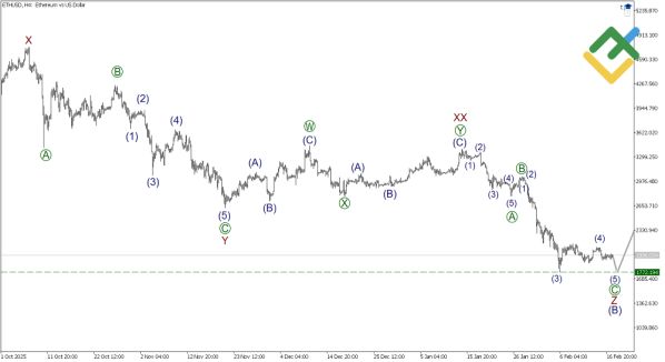 Волновой анализ Эфириума раскрывает восходящий зигзаг (A)-(B)-(C), где импульс (A) окончен, а коррекция (B) принимает вид тройного зигзага W-X-Y-XX-Z. Волна Y и связка XX в форме двойной тройки сформированы, и теперь развивается финальная Z к 1772.19 — минимуму подволны (3). Это подтверждает медвежий уклон.
