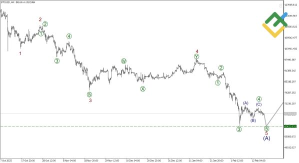 Подробный волновой разбор Биткоина показывает формирование импульсной волны (A) с подволнами 1-2-3-4-5. Первые четыре сегмента завершены, а финальная подволна 5 принимает форму импульса [1]-[2]-[3]-[4]-[5]. Коррекция [4] в виде зигзага (A)-(B)-(C) вероятно закончилась, и теперь ожидается падение в [5] к 60622.63 — уровню, ранее достигнутому [3]. Текущая цена около 67709.12 усиливает медвежий сценарий.