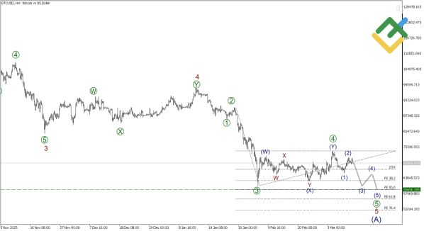 - BTCUSD: предполагается развитие конечной части импульса 5. Рекомендуется рассматривать сделки на продажу с целью на уровне 59456.39.