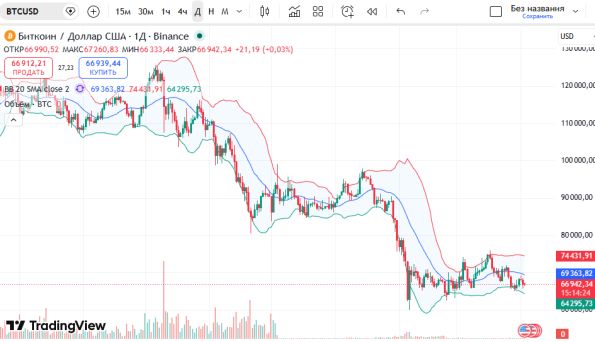 Непосредственная поддержка находится у нижней границы канала на 65 900 долларов. Пробой этого уровня откроет путь к психологической отметке 60 000.