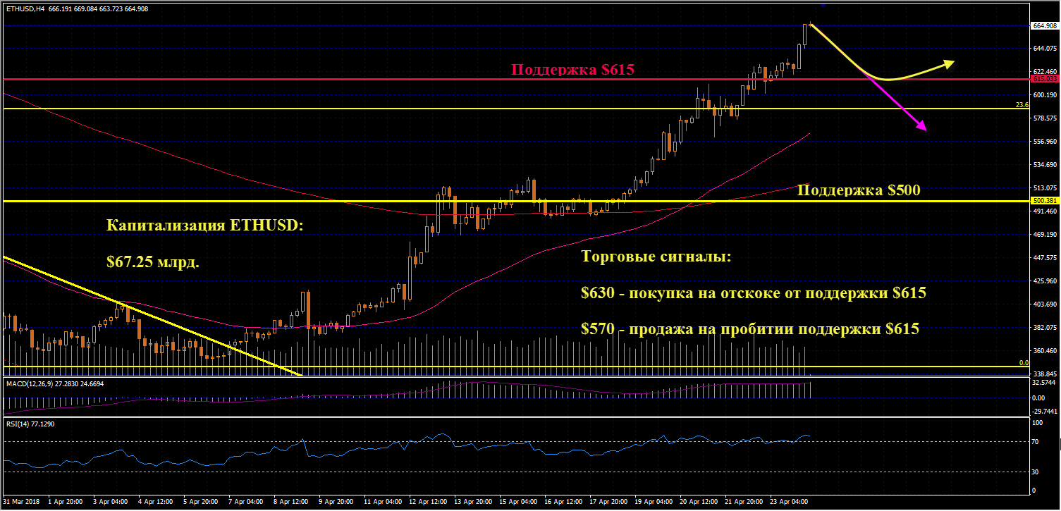 Технический анализ и прогноз криптовалют Ethereum ETHUSD 24.04.2018: Эфириум пробил уровень $615, затем протестировал его сверху и продолжил рост. Но сильная перекупленность на RSI вызывает сомнения в дальнейшем росте. Монета может вернуться к поддержке $615 для повторного тестирования. В случае отскока наращиваем лонги в Эфире, начиная с отметки $630. Короткие позиции открываем по цене от $570, если уровень $615 будет пробит вниз.