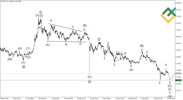 Анализ графика XRPUSD показывает, что в глобальной перспективе формируется бычий импульс, однако на данный момент мы находимся внутри глубокой коррекционной волны (4). Она имеет сложную структуру двойного зигзага W-X-Y. В настоящий момент развивается действующая волна Y, которая сама по себе также является двойным зигзагом [W]-[X]-[Y].
