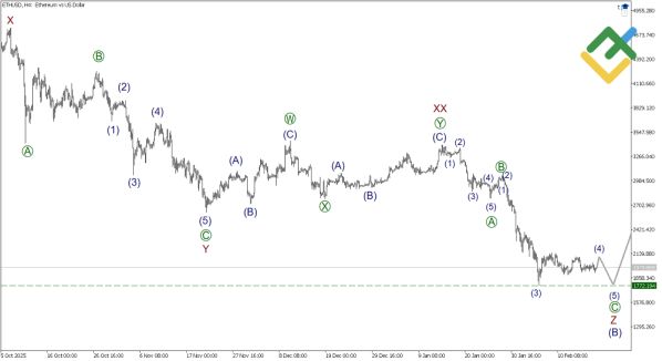 Эфириум, согласно волновой разметке, находится в процессе построения крупного восходящего зигзага (A)-(B)-(C). Мощная импульсная волна (A) уже завершена. Сейчас рынок корректируется, формируя сложную и затяжную коррекцию (B). Она имеет структуру тройного зигзага W-X-Y-XX-Z.