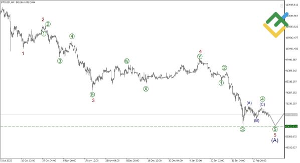 Согласно нашему анализу, недавно завершилась коррекционная волна [4], принявшая форму зигзага (A)-(B)-(C). Это дает основание полагать, что рынок готов к финальному рывку вниз в рамках подволны [5]. Ключевым уровнем поддержки и целевой отметкой для продавцов выступает минимум, ранее установленный подволной [3] — 60622.63. Пробой этого уровня подтвердит силу медвежьего тренда и откроет дорогу для дальнейшего снижения.