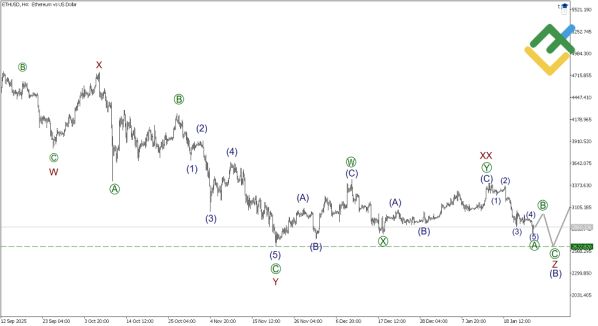 Эфириум на H4 строит крупный восходящий зигзаг (A)-(B)-(C). Импульсная волна (A) полностью завершена. Сейчас формируется коррекция (B) в виде сложного тройного зигзага W-X-Y-XX-Z.