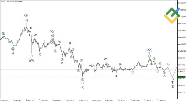 Недавно закончилась связующая волна (XX) в виде двойного зигзага. Сейчас цена находится в финальной зигзагообразной волне (Z), внутри которой уже развивается импульс A-B-C. Наиболее вероятная цель снижения — минимум предыдущей подволны (Y) на уровне 80770.57.