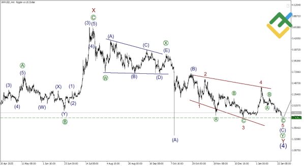 - XRPUSD — конечный диагональник в волне [C] of (C) в рамках коррекции (4). Цель снижения — 1.764.