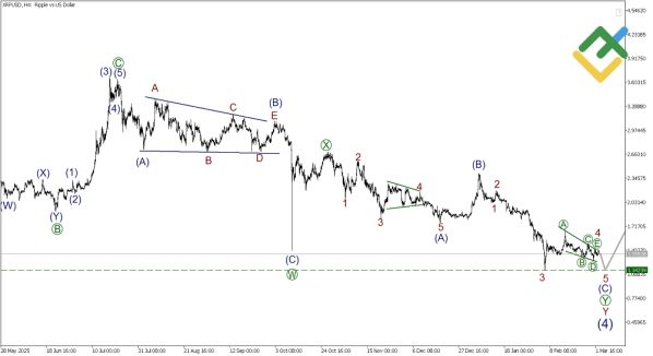 Активность по XRPUSD остается высокой, но вектор движения сохраняется нисходящим. В глобальном масштабе формируется бычий импульс (1)-(2)-(3)-(4)-(5), однако сейчас мы находимся на стадии сложной коррекции (4). Эта коррекция принимает форму двойного зигзага W-X-Y.