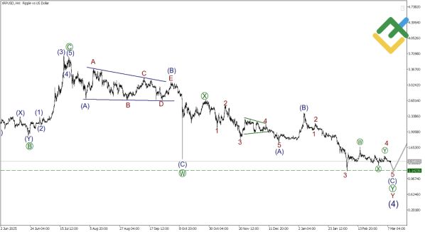Глобально Рипл формирует бычий импульс (1)-(2)-(3)-(4)-(5), но сейчас в фокусе коррекция (4) как двойной зигзаг W-X-Y. Действующая волна Y также принимает форму двойного зигзага [W]-[X]-[Y]. Внутри [Y] завершены импульс (A) и коррекция (B), а (C) развивается как импульс 1-2-3-4-5. Сложная коррекция 4 в виде [W]-[X]-[Y] уже позади, и ожидается падение в подволне 5 of (C) к отметке 1.142 — минимуму предыдущих циклов.