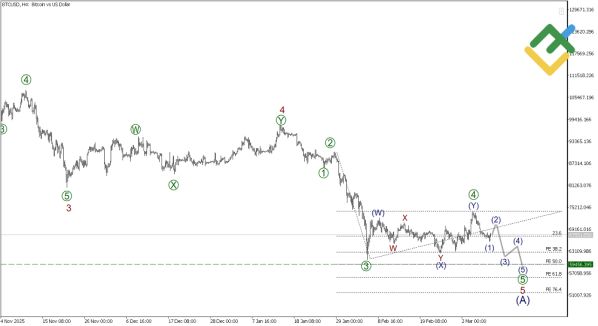В долгосрочной перспективе Биткоин строит медвежий зигзаг (A)-(B)-(C), где импульс (A)接近 к завершению. Первые четыре подволны уже сформированы, и сейчас развивается финальная пятая. Коррекция [4] of 5, вероятно, закончилась как двойная тройка, открывая путь для снижения в [5] of 5. Целевой уровень — 59456.39, где может завершиться импульс. Это сценарий подразумевает преобладание продавцов в ближайшие сессии.