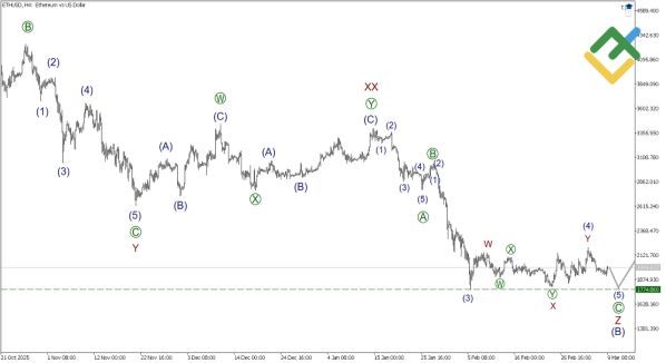 Эфириум строит крупный восходящий зигзаг (A)-(B)-(C), с завершенной импульсной (A). Коррекция (B) принимает вид тройного зигзага, где волна Z формируется как [A]-[B]-[C]. Коррекция (4) of [C] закончилась двойной тройкой W-X-Y, и теперь подволна (5) направлена вниз к уровню 1774.86. Это указывает на потенциальное усиление давления продавцов в краткосрочке.